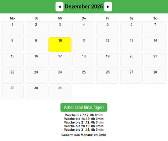 Meine Frau bat mich, ihr einen lokalen Arbeitszeit Kalender zu programmieren. Das kam dabei raus. Alle Daten werden lokal auf dem Endegerät gespeichert